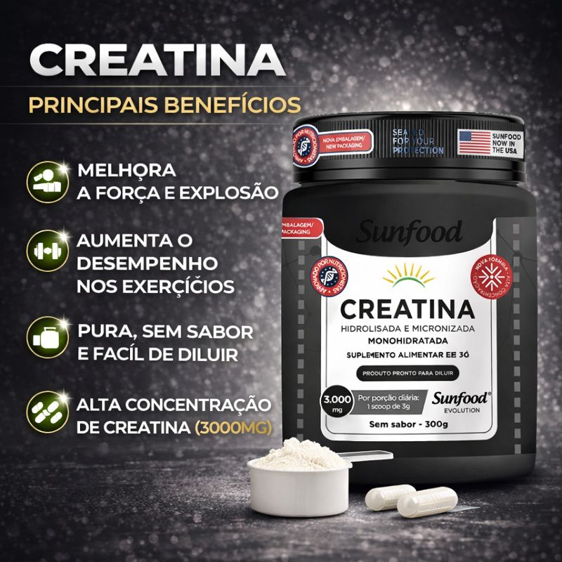 A Creatina Sunfood Evolution de 300g é o suplemento ideal para quem busca máxima performance, força e ganho de massa muscular com uma fórmula de alta tecnologia. Este produto combina os processos de hidrolisação e micronização, o que resulta em partículas menores que facilitam a dissolução e aceleram a absorção pelo corpo.