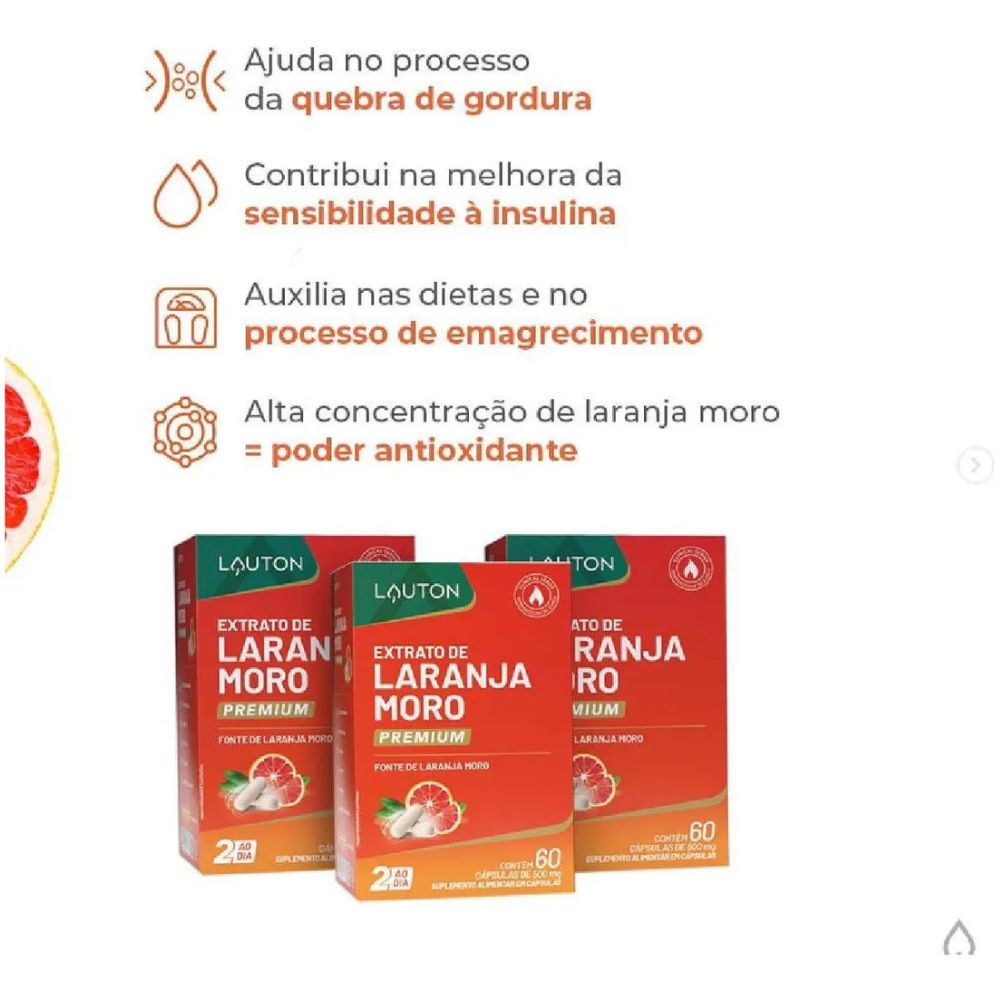 Dica: O Extrato de Laranja Moro é frequentemente utilizado em dietas de controle de peso e auxílio ao metabolismo, devido às suas propriedades antioxidantes.