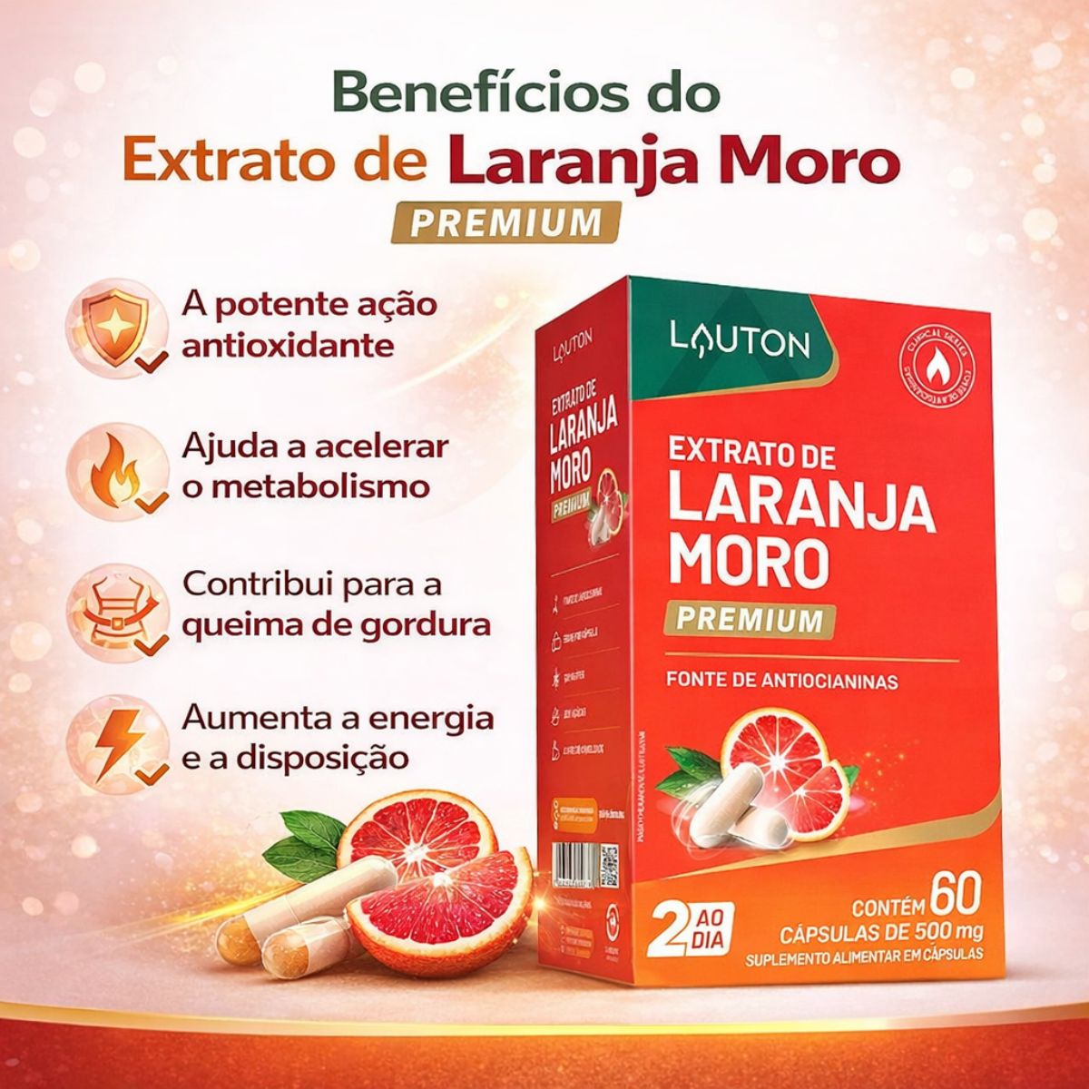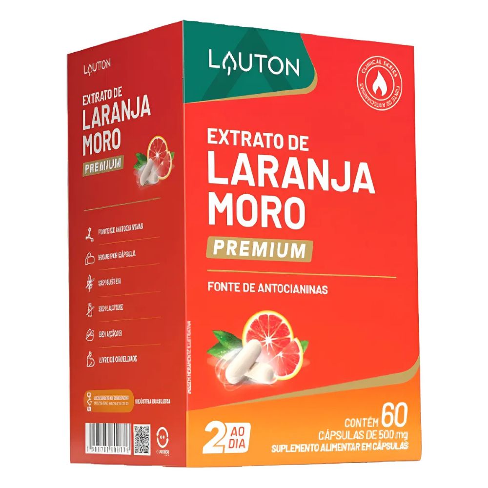 A embalagem utiliza cores vibrantes em tons de laranja e vermelho, remetendo à laranja vermelha (Moro). A identidade visual é padronizada com os demais produtos da marca Lauton, focando na clareza das informações nutricionais e dos benefícios do extrato.