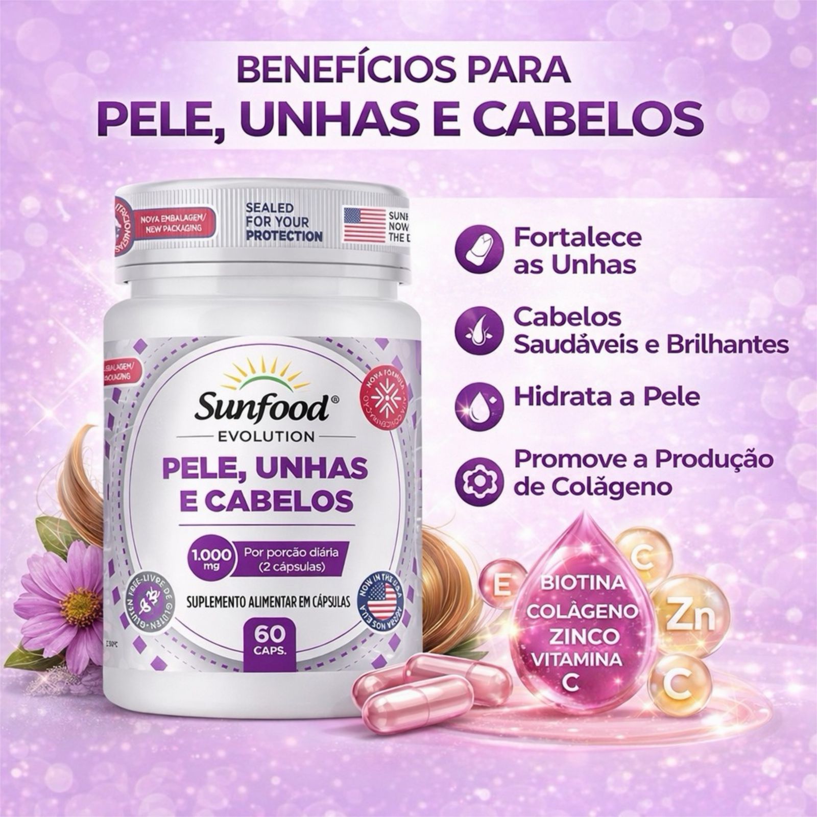 O suplemento Pele, Unhas e Cabelos Sunfood Evolution foi desenvolvido especialmente para quem deseja cuidar da beleza e da saúde de dentro para fora.